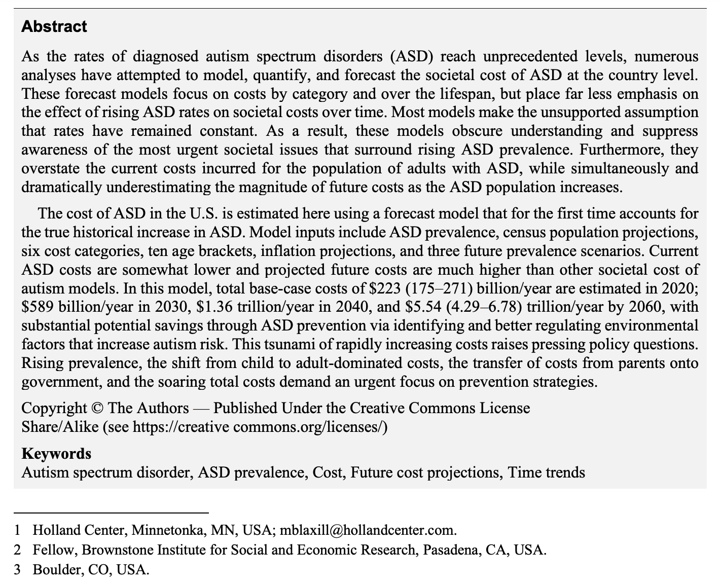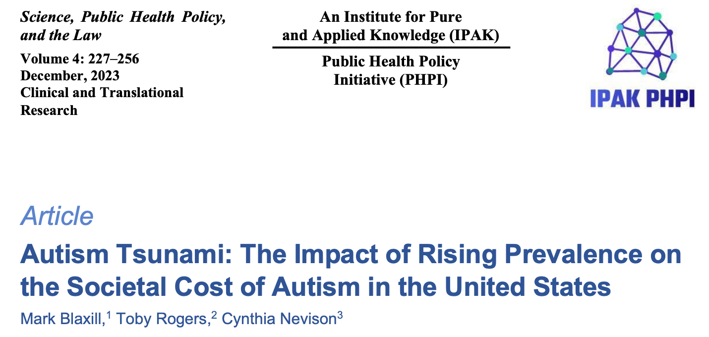As many of you know, from 2019 to 2021, Mark Blaxill, Cynthia Nevison, and I built the best societal cost of autism model ever developed. Previous societal cost of autism models assumed constant prevalence. But the one thing we know about autism is that the rates are increasing over time. So with Mark’s best-in-class prevalence history and Cynthia’s computer programming genius we built a model showing how much autism will likely cost the United States over the next 40 years. Titled, “Autism Tsunami: The Impact of Rising Prevalence on the Societal Cost of Autism in the United States” our manuscript sailed through peer review. It quickly became one of the most downloaded articles on the Journal of Autism and Developmental Disorders (JADD) website.