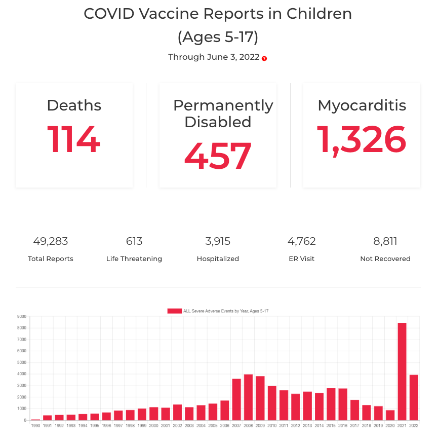 There are now 49,283 VAERS reports of adverse events in children following Covid shots including 114 reports of death, 457 reports of permanent disability, and 1,326 reports of myocarditis. These reports likely understate harms by a factor of 41 to 100.