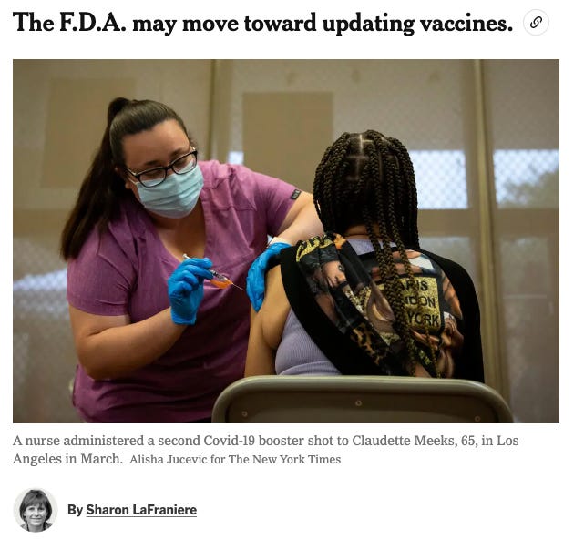 Ahead of the meeting tomorrow of the Vaccines and Related Biological Products Advisory Committee (VRBPAC), the FDA and Pharma are leaking their preferred narratives about the proposed “Future Framework” to Sharon LaFraniere at the NY Times. But cracks are appearing in the FDA’s usually well-scripted plan. Ms. LaFraniere quotes three people as voicing doubts about the viability and advisability of reformulated Covid-19 shots. Even though the NY Times does its usual Pharma cheerleading, there is an undercurrent of concern that runs throughout the piece.
