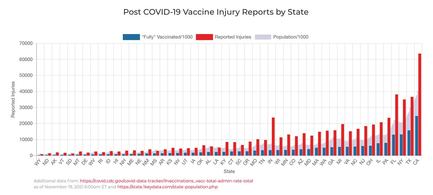 As you can see, the number of covid vaccine injury reports in each state corresponds to the number of people fully vaccinated in that state. While this is obvious to everyone who has been paying attention, this will be a revelation to people who tried to bury their head in the sand in hopes that this problem would go away on its own.