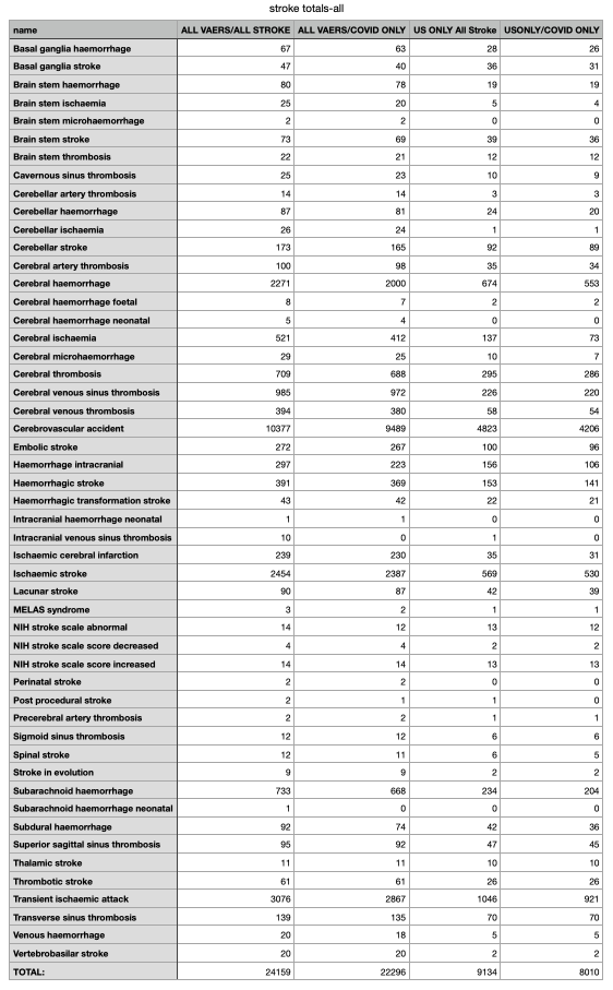 Reading the totals across the bottom, there are 24,159 reports of stroke in VAERS for all vaccines over the last 32 years. Over 92% of those reports (22,296) are following Covid vaccines (so, just in the last two years, an obvious safety signal). If one only wants to look at U.S. reports there were 9,134 reports of stroke following any vaccine in the last 32 years. And 87% of those reports (8,010) are following Covid vaccines. All independent scholars agree that these are significant undercounts of the actual harms.