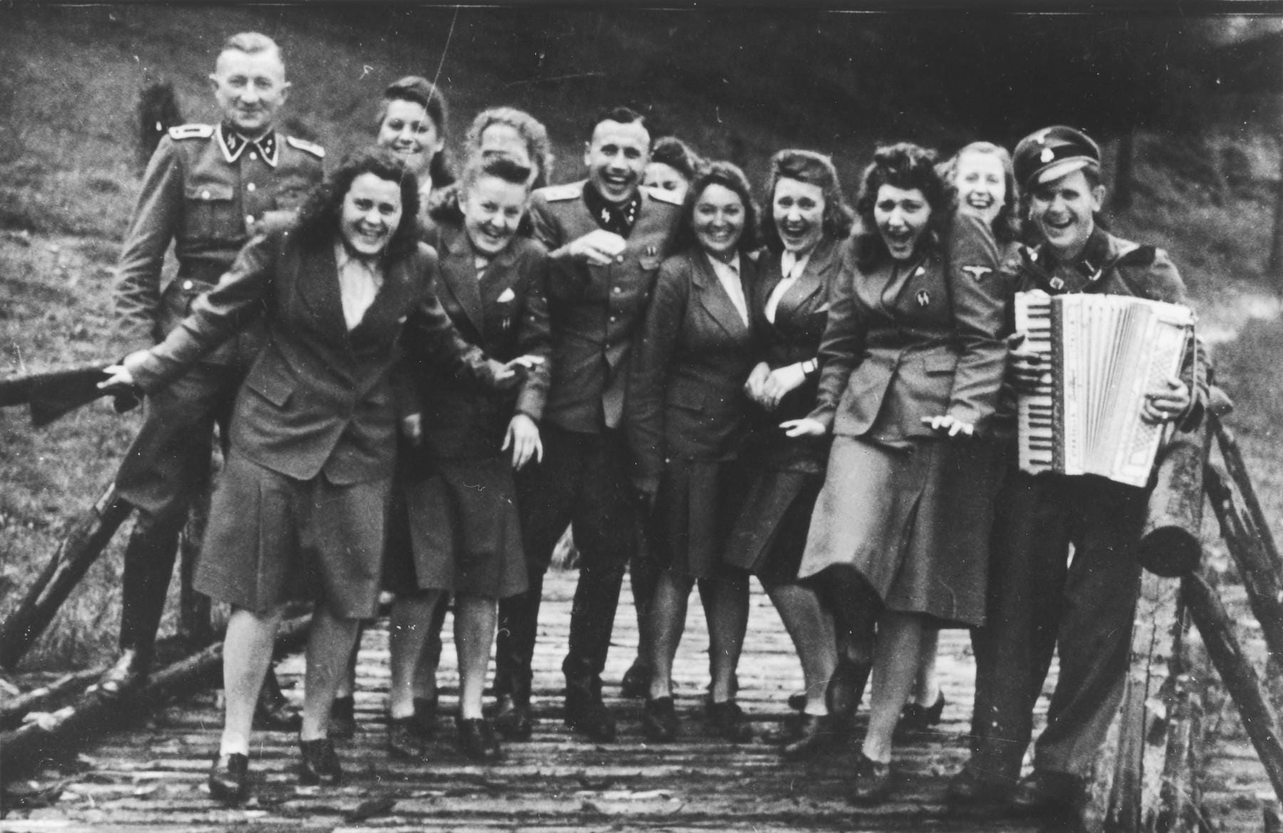 The photos of the staff who worked at Auschwitz show them laughing, smiling, flirting, and singing along to an accordion. If one did not know the context of this photo one might be inclined to think that this was a swell bunch.