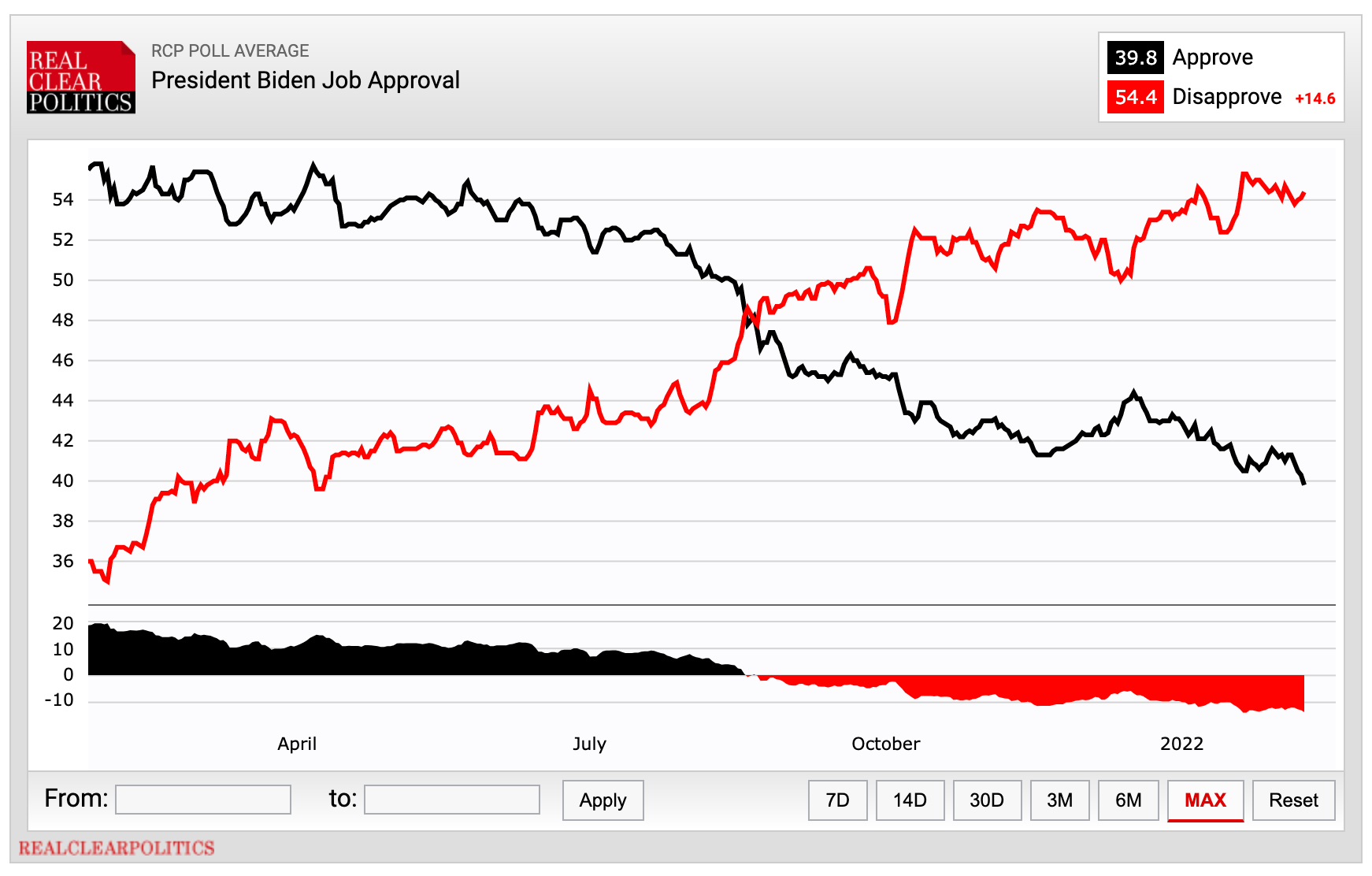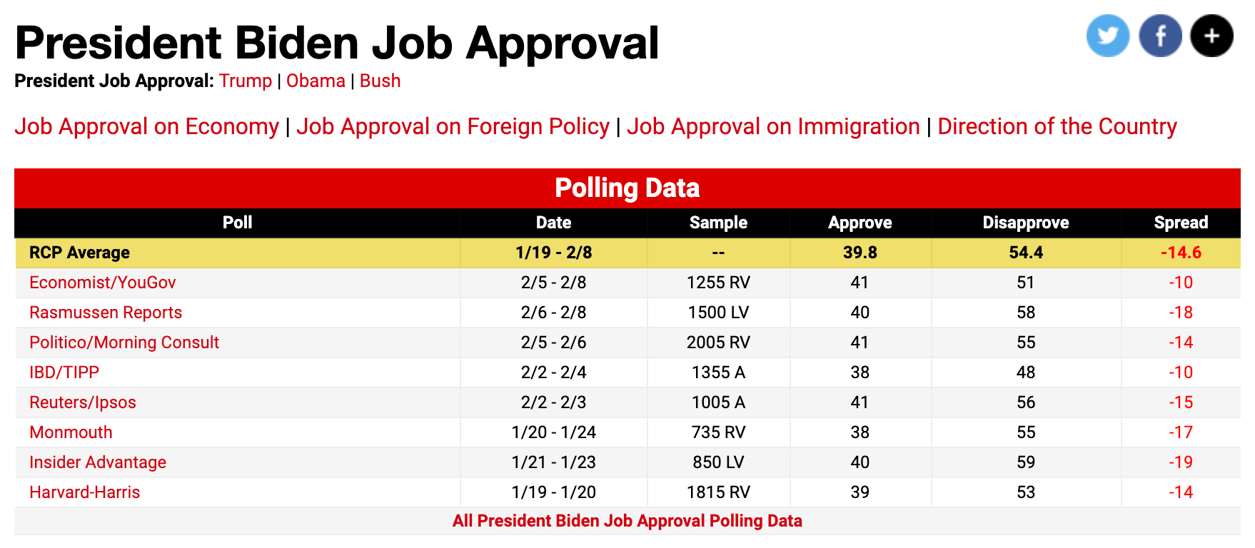 The wonderful Jeffrey Tucker at the Brownstone Institute draws our attention to this stunning new data from Real Clear Politics. The average of the eight most recent polls shows Biden’s approval rating at 39.8%. The polling average shows that he is 14.6 points underwater and some polls have him as much as 19 points underwater.