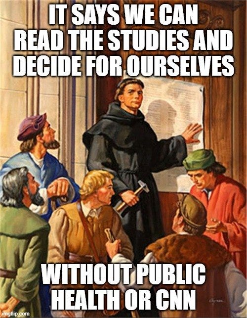 That’s the revolution that we are in — and it’s why the fighting is so fierce. There is no reason to allow your doctor to speak to you in Latin. You can read the study for yourself. That is leading to a massive shift in power away from the gatekeepers to the people — and so the feudal lords have decided to massacre us (in ways that are reminiscent of the German Peasants’ War).