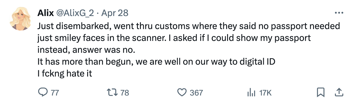 And those digital vaccine passports that we’ve been gearing up to fight? There’s never going to be a vote about those either. There’s not going to be an app on your phone. There’s just going to be a camera at the airport that scans your face and looks you up in their database. You never opt in or out, it just is.