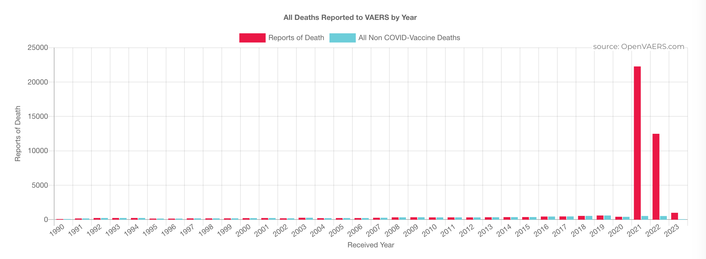 Sane people look at this chart and observe that the red bars in 2021, 2022, and thus far in 2023 — that represent vaccine fatalities reported to VAERS — are larger than the bars in years 1990 to 2020.